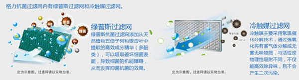 格力抗菌过滤网内有绿普斯过滤网和冷触媒过滤网。